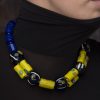 Delia est un tour de cou d’aspect simple et naturel. Les perles de verre translucides de couleur bleue ont été enfilées sur un fil de coton et rehaussées de quatre formes cylindriques de couleur jaune. Les dessins sur les perles de verre sont peints à la main, ce qui donne du relief au collier.